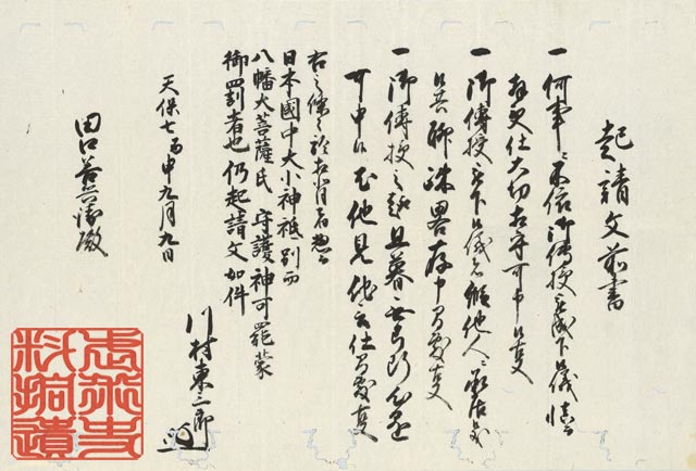 入門する者は、師家の「神文」に署名・書判・血判して門弟になります。入門して未だ伝書を伝授されていない門弟を「初学」と云います。