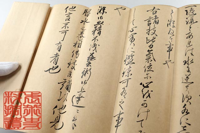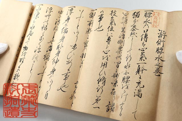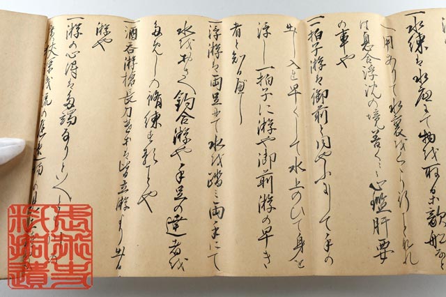 こゝに掲載の『小堀流踏水術游術腰水之巻』は、多分に猿木宗那翁の自筆と見られます。上質にして平滑な料紙に鋭く端正な筆跡、さながら一つの作品を見るようで、とても気に入っている伝書の一つです。